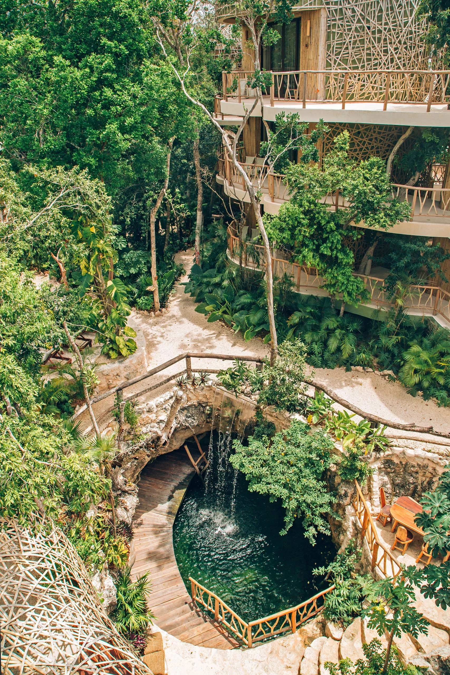 The KAN cenote was a gift from the Gods when discovered during the beginning of the project. This serendipitous discovery caused a redesign of the project, allowing this glorious revelation to shine front and centre. The addition of a small waterfall allows for circulation throughout this fully intact cenote.